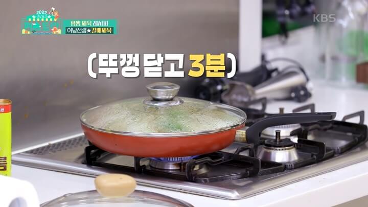 뚜껑을 덮어서 약불에서 익혀줍니다. 뚜껑을 열고 익히면 국물이 없어지게 되고, 뚜껑을 닫아 익히면 국물이 자작하면서 촉촉한 제육볶음이 만들어져요. 촉촉한 제육볶음을 위해 뚜껑을 닫고 3분 정도 익혀줍니다.