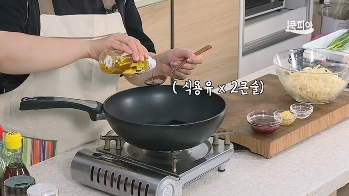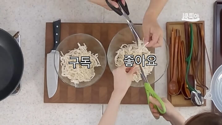 진미채는 물에 재빨리 한번 씻어낸 후 마른 팬에 덖어서 물기를 날려줍니다. 그런 다음 진미채를 먹기 좋은 크기로 잘라줍니다. 3cm 정도의 길이로 해서 가위로 잘라주면 됩니다.