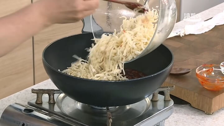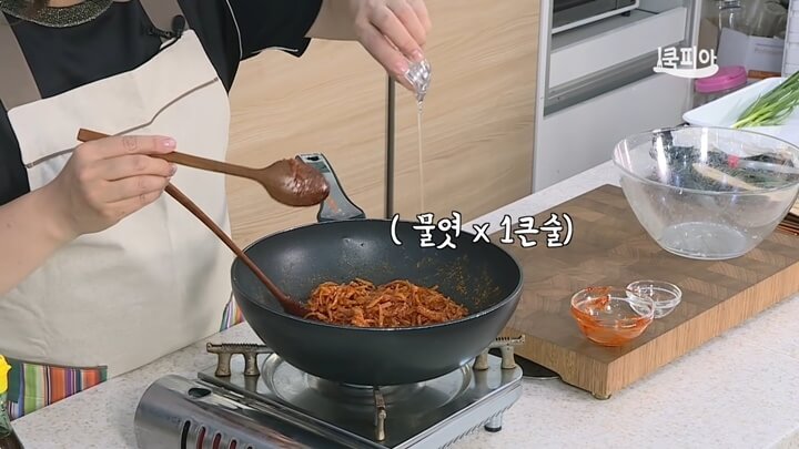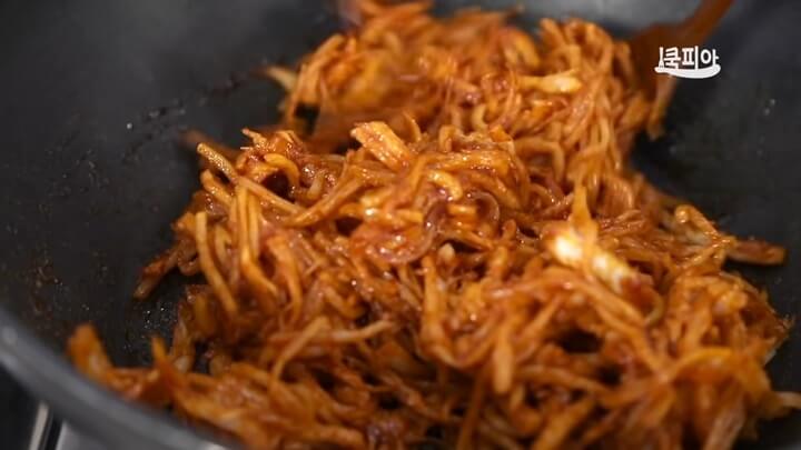 양념을 다 버무렸다면 다시 불을 켜고 중불 정도로 낮춘 후 진미채를 볶아줍니다.