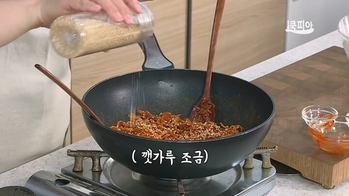 불을 끈 상태에서 양념을 버무리는 이유는 만약 강불 상태에서 진미채를 넣고 버무리면 양념이 속까지 배지 않고 겉돌면서 타버릴 수 있고, 타버리면 맛이 없는 냄새가 납니다. 그러니 불을 끄고 양념을 충분히 잘 버무려 주세요.