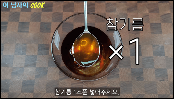 4) 참기름 1스푼을 넣어 고소한 향과 맛, 부드러움을 더해줍니다.