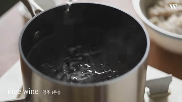 끓는 물에 소금을 약간 넣고 청주도 1큰술 넣어줍니다. 청주를 넣고 쭈꾸미를 데치면 비린내를 제거할 수 있어요.