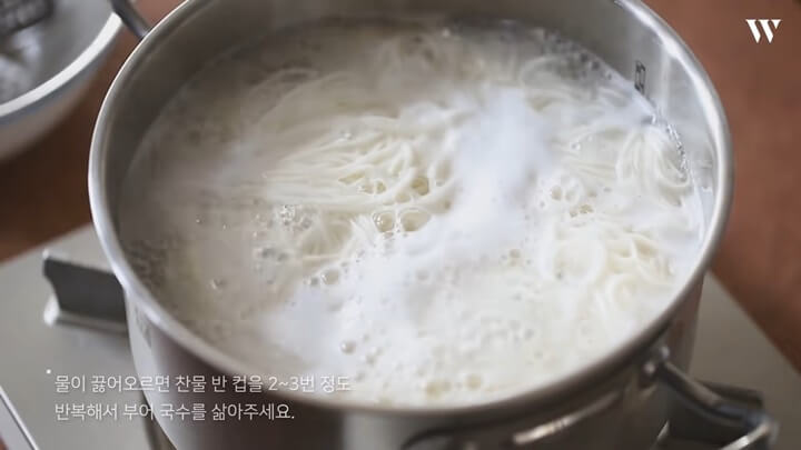 소면을 넣고 물이 끓어오르면 찬물을 부어주고, 또 끓어오르면 찬물을 부어주는 과정을 2~3번 반복해서 삶아요. 그러면 국수가 쫄깃해진답니다.