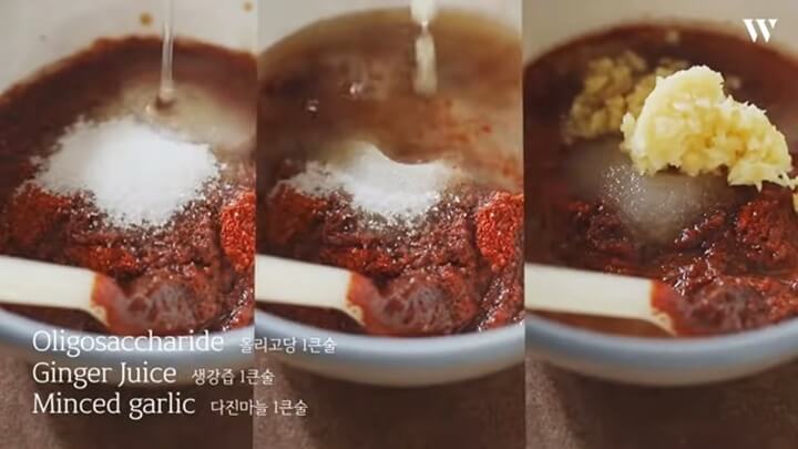 고추장 3큰술에 고춧가루 2큰술을 넣고, 간장 2큰술, 맛술 1큰술, 설탕 1큰술을 넣어줍니다. 올리고당 1큰술, 생강즙 1큰술, 다진 마늘 1큰술, 후춧가루 약간을 넣고 잘 섞어줍니다.