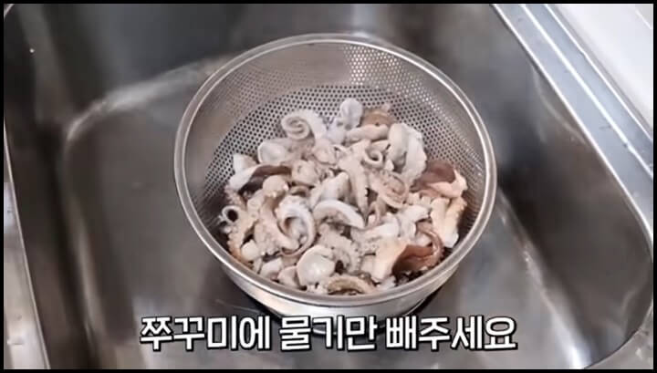찐 쭈꾸미는 체에 밭쳐서 물기만 빼 줍니다. 찬물에 헹구지 말고 그대로 식히기만 하면 됩니다.