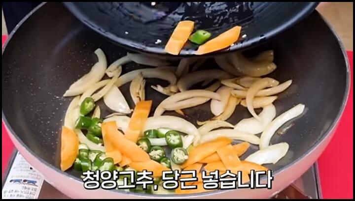 양파가 노릇하게 볶아졌다면 청양고추와 당근을 넣어줍니다. 당근에서도 수분이 많이 나오기 때문에 이렇게 볶아서 수분을 날려줘야 합니다 쭈꾸미볶음은 수분이 없을수록 맛있습니다. 살짝 볶으면서 수분을 날려주고 어느정도 볶아졌다면 불을 끕니다. 그리고 남은 잔열로 살짝 볶아줍니다.