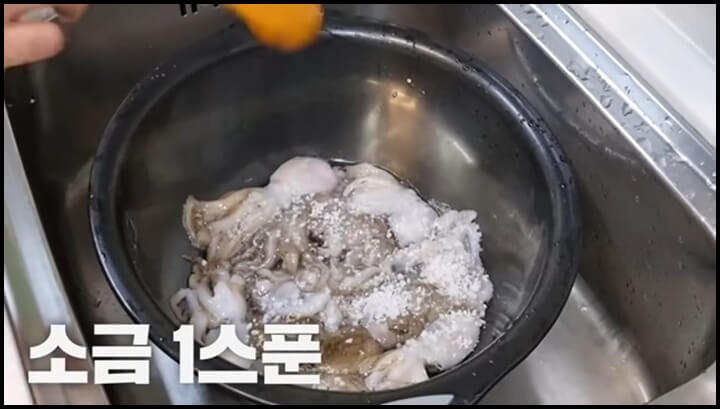 쭈꾸미에 소금 1스푼을 넣고, 밀가루 2스푼을 넣어줍니다. 그리고 손으로 주물러줍니다. 밀가루는 흡착력이 있어서 쭈꾸미에 붙어있는 이물질을 제거하는데 좋습니다.