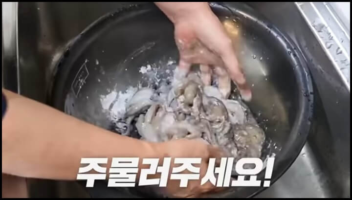 4) 물을 틀어서 쭈꾸미를 씻어줍니다.
