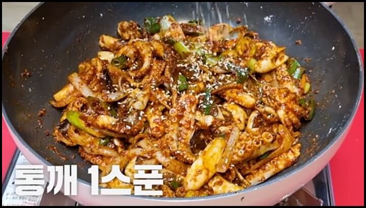 참기름 1스푼, 후추 3꼬집, 통깨 1스푼을 넣고 한번만 볶아주면 쭈꾸미볶음 완성입니다.