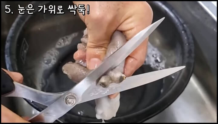 이렇게 한마리씩 손질해주면 되고, 손질한 쭈꾸미는 물에 한번 깨끗이 씻어줍니다.