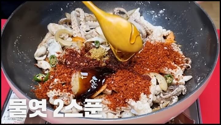 팬이 조금 식으면 쭈꾸미를 넣어줍니다. 그리고 감자전분 1스푼을 넣고 골고루 잘 섞어줍니다. 감자전분을 넣고 만들면 진짜 맛있는 쭈꾸미볶음이 만들어집니다.