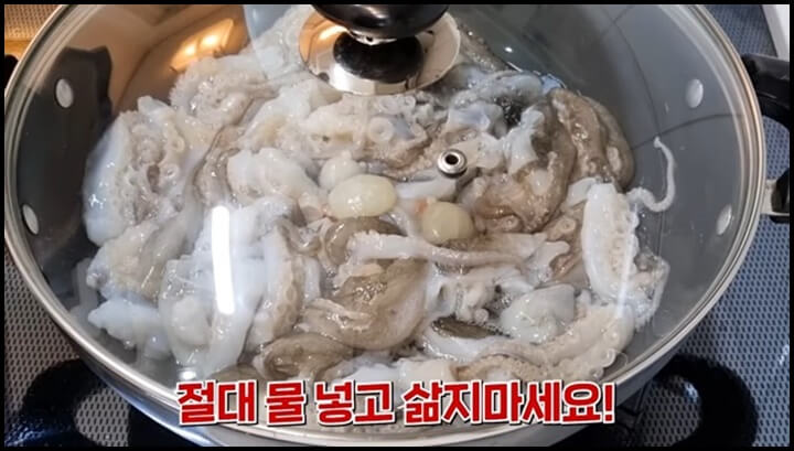 쭈꾸미는 절대 물 넣고 삶지 마세요! 물 넣고 삶게 되면 쭈꾸미의 맛있는 물이 다 빠져버립니다. 그리고 너무 오래 삶으면 질겨지니 딱 1분 30초만 쪄 주면 됩니다.
