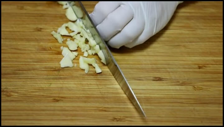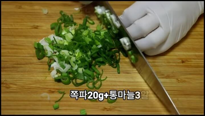 그리고 통마늘 3알을 준비해서 칼로 다져주는데요, 참나물 무침 뿐 아니라 나물 요리에는 간 마늘을 넣는 것보다 통마늘을 직접 다져서 넣으면 마늘의 특유의 감칠맛과 신선한 향으로 나물 무침 요리가 더욱 맛있어집니다.