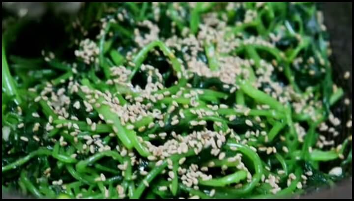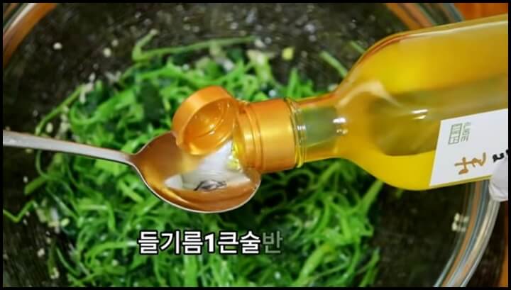 마지막으로 들기름 1큰술 반을 넣어주고, 통깨 솔솔 뿌려서 무쳐주면 참나물 무침 완성입니다.