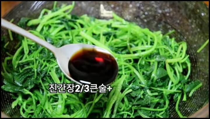 진간장 2/3큰술과 국간장 2/3큰술을 넣은 다음 쪽파와 다진 마늘을 넣어주고 손으로 살살 무쳐줍니다. 억세지 않은 참나물은 바락바락 무칠 필요 없이 손으로 살살 흔들어가며 부드럽게 무쳐주면 됩니다.