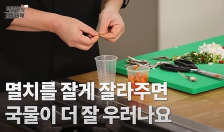 국물용 멸치는 대가리와 내장을 떼고 가시도 제거한 후 잘게 잘라주어요. 이렇게 잘게 자르면 국물이 더 잘 우러난다고 해요. 만약 냉동실에 보관하고 있던 멸치라 마른 팬이나 냄비에 한번 볶아서 수분과 비린내를 날려주면 더욱 좋아요.