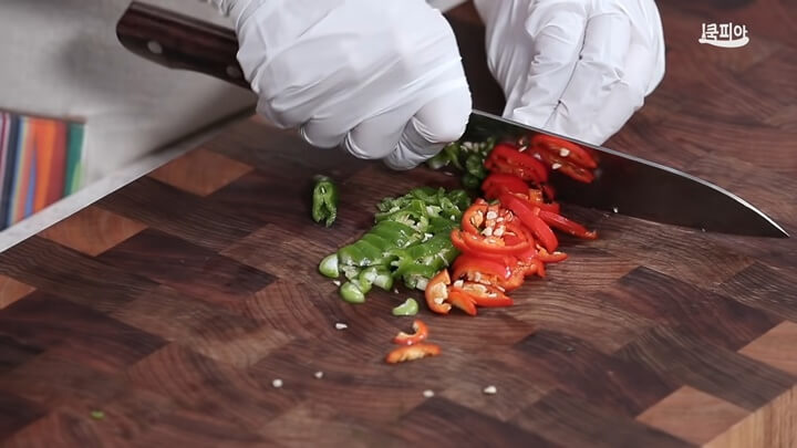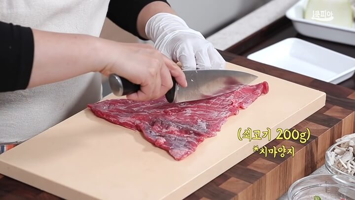소고기 치마양지는 굵게 채 썰어 주는데, 따로 밑간 하지 않고 그대로 사용하면 됩니다.