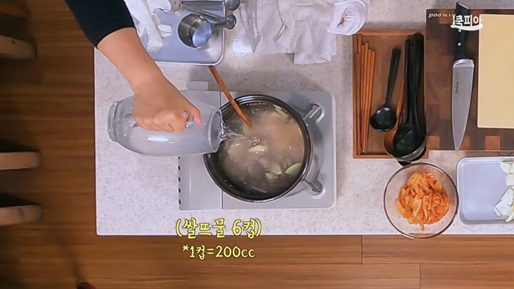 이 때 쌀뜨물 6컵을 부어줍니다. 쌀뜨물 6컵 분량이 5컵 분량 정도가 되도록 진하게 끓여줍니다.