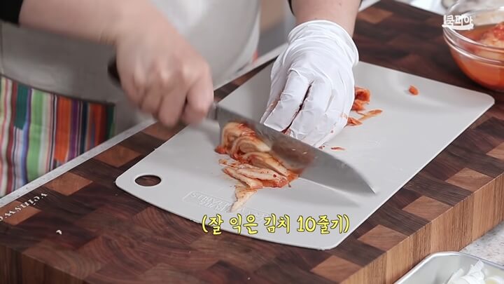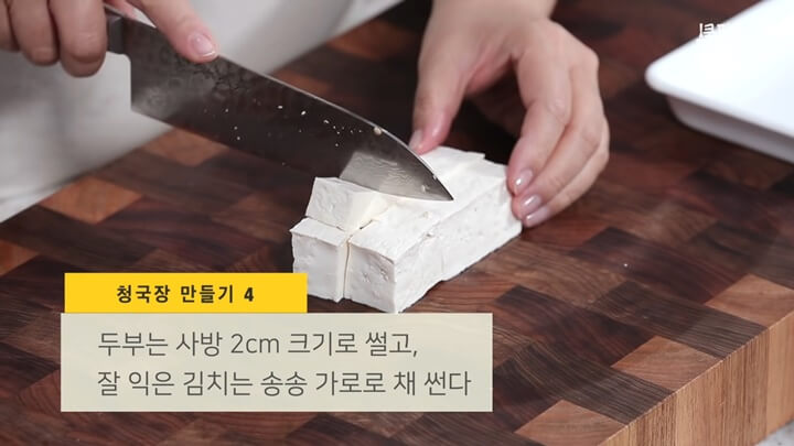 두부는 사방 2cm 크기로 썰고, 잘 익은 김치는 물기를 조금 짠 후에 채 썰어서 준비합니다. 김치는 10줄기 정도 준비하면 되는데 만약 김치 맛이 많이 나는 것이 싫다면 5줄기 정도만 넣어주면 됩니다.