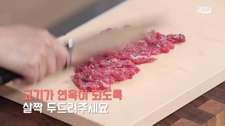 고기를 채 썬 후에 연육이 되도록 칼로 살짝 두드려 줍니다.