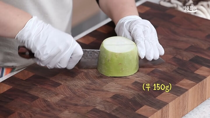 청국장 맛있게 끓이는 방법에 빠지지 않고 넣어야 할 재료는 바로 무인데요, 무를 넣어주면 청국장 밑국물 맛을 더욱 좋게 해 줍니다. 무를 2.5cm 크기로 납작하게 썰어줍니다.