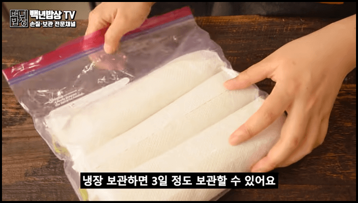 속껍질을 남기고 겉껍질을 깐 후 옥수수를 한 개씩 키친타월로 돌돌 말아 지퍼백에 넣어줍니다. 지퍼팩에 넣고 밀봉하여 냉장 보관하면 3일 정도 보관할 수 있습니다.