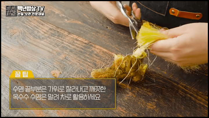4) 옥수수 수염은 한 번에 잡아당겨 제거해 줍니다. 옥수수 수염은 끝의 지저분한 것은 잘라내고 깨끗이 씻어서 말린 후 옥수수 수염차로 즐기셔도 좋습니다.
