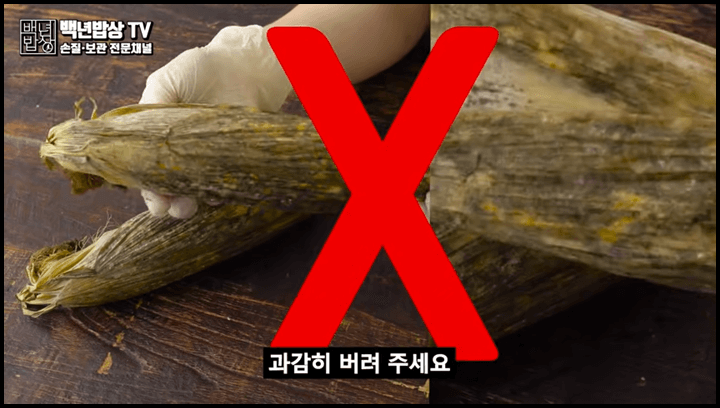 ● 옥수수를 선별하여 상태가 안 좋은 것은 먼저 빨리 먹고, 상한 옥수수는 버립니다.