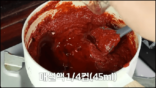찹쌀풀이 식으면 매실액 4컵, 멸치액젓 1/2컵을 넣어서 잘 섞어줍니다.