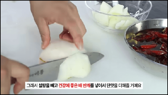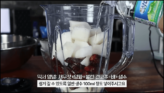 새우젓 국물은 빼고 건더기만 3큰술 넣고, 양파 1개 적당하게 썰고, 홍고추 또는 불린 건고추 8개도 믹서기에 갈기 좋게 잘라줍니다. 배 1/2개도 썰어 넣어 단맛을 더해줍니다. 믹서기에 재료를 다 넣고 물 100ml정도 넣어서 갈아줍니다.