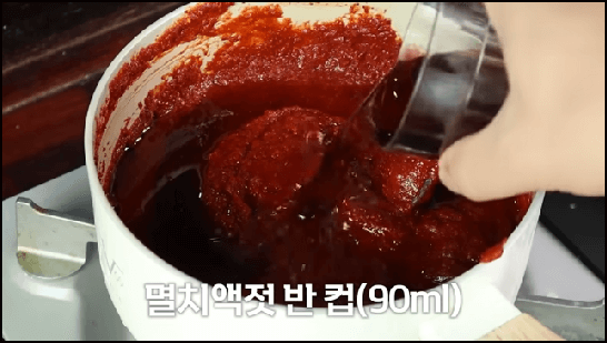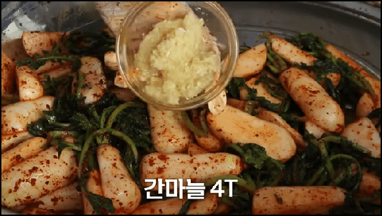 여기에 간 마늘 4큰술을 넣고, 믹서기에 간 양념을 모두 넣은 다음, 찹쌀풀 양념장도 모두 넣어줍니다. 그리고 잘 버무려주면 됩니다.