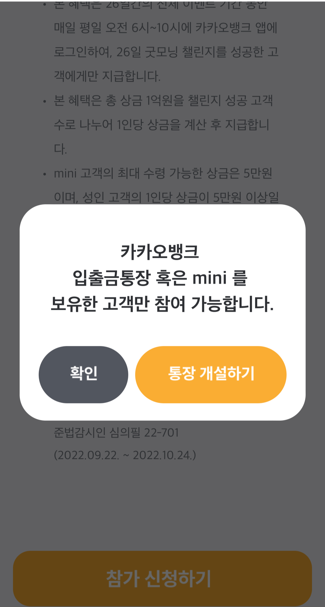 7. 카카오뱅크 굿모닝 챌린지는 카카오뱅크 입출금 통장 또는 mini를 보유한 고객만 참여가 가능합니다.