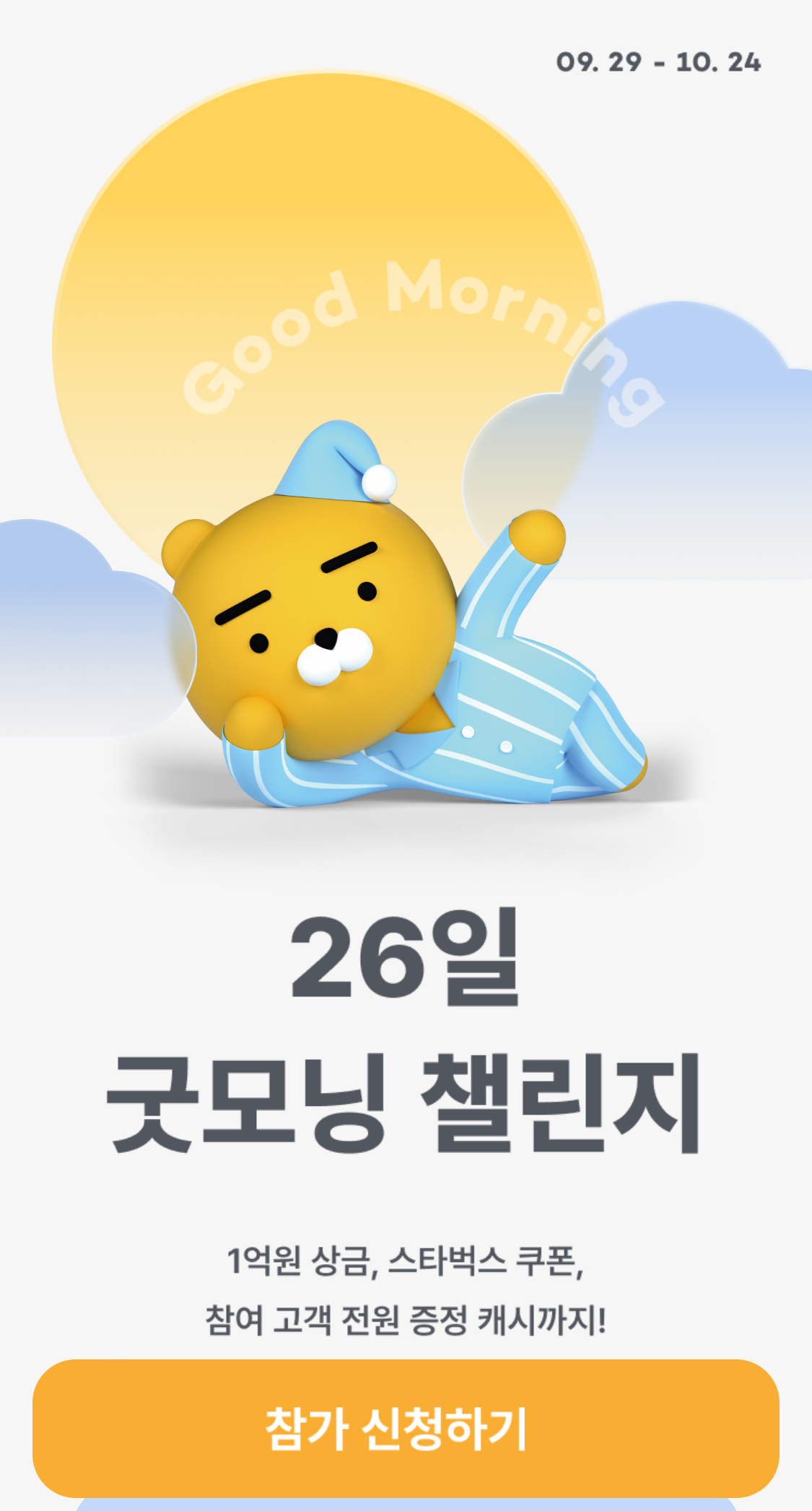 카카오뱅크 통장을 보유한 분들은 바로 참가 신청이 가능하니 굿모닝 챌린지에 참여해 보시고, 매일 굿모닝 캐시와 스타벅스 쿠폰 추첨, 1억원의 상금 혜택을 누려보시길 바랍니다.