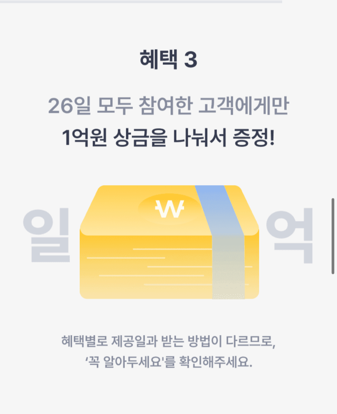 세번째 혜택은 상금 1억원이 걸렸습니다. 물론 한 명에게 주는 것이 아니고요, 26일간 굿모닝 챌린지를 모두 참여한 분들만 해당이 되며, 상금 1억원/N명의 금액을 받게 됩니다.