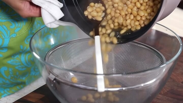 삶은 콩은 재빨리 체에 밭쳐서 물기를 빼 주어야 해요. 왜냐하면 삶은 콩을 너무 오래 그대로 두면 메주 냄새가 나기 때문이에요.