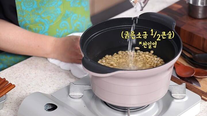 그리고 가장 맛있게 삶기 위해서 여기에 천일염 1/2큰술을 함께 넣어줍니다. 천일염을 넣고 콩을 끓여서 삶아줍니다.