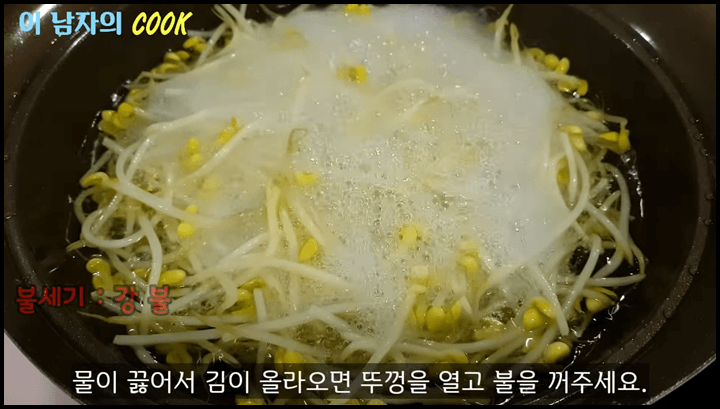 3) 콩나물국밥 대박집의 비법은 콩나물을 살짝만 삶은 것인데요, 콩나물이 잠길 정도의 물을 끓인 후에 콩나물을 넣고 뚜껑을 닫아줍니다.