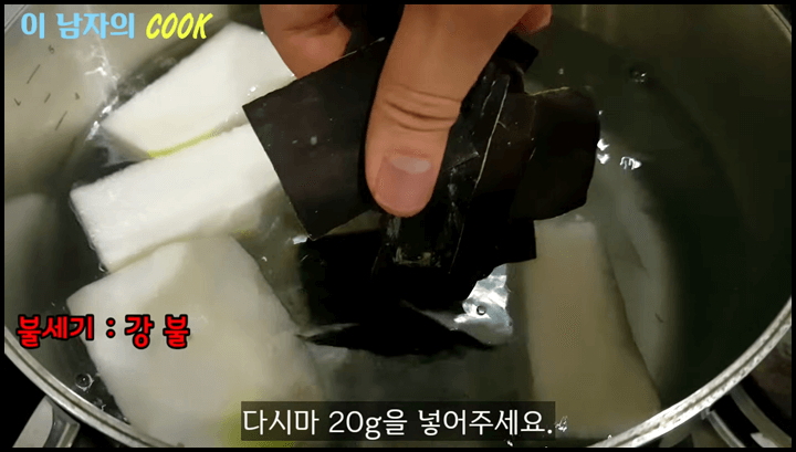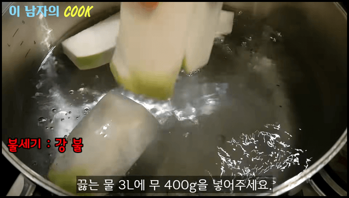 1) 물 3리터를 냄비에 넣고 무 400g을 잘라서 넣어줍니다.