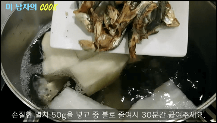 5) 손질한 멸치늘 넣고 중불로 줄여서 30분간 끓여줍니다.