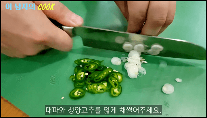1) 고명으로 올릴 대파와 청양고추를 얇게 채 썰어 준비합니다.