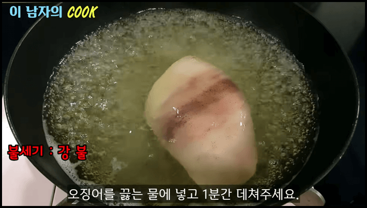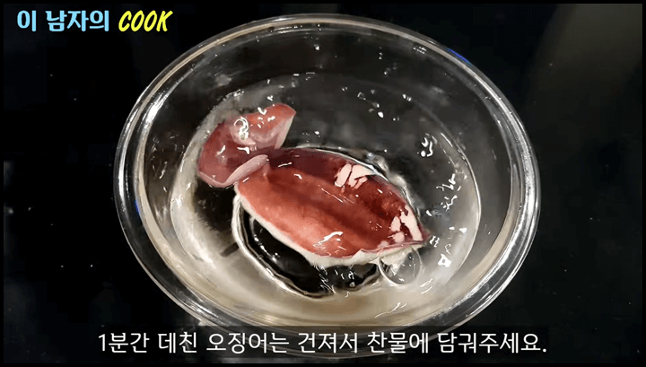 3) 데친 오징어는 건져서 바로 찬물에 담가줍니다.
