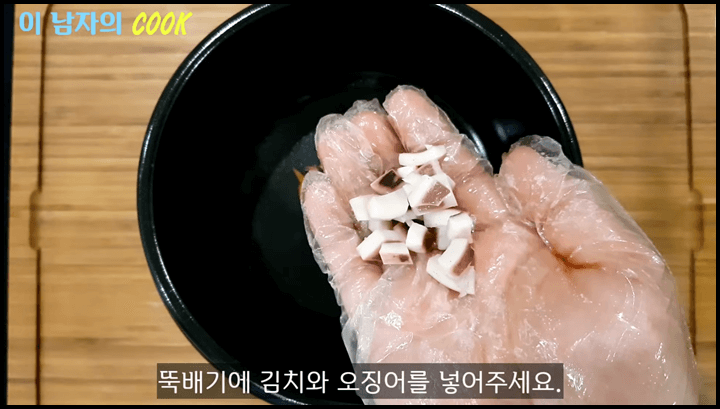 2) 제일 먼저 김치와 오징어를 넣어줍니다.