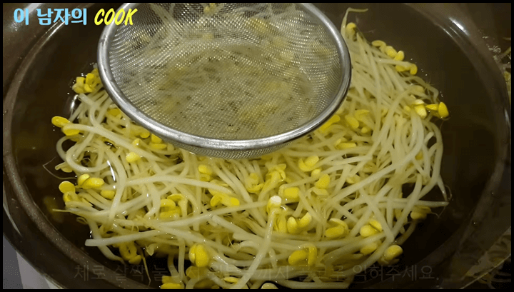 5) 채로 살짝 눌러서 콩나물 위까지 골고루 익혀줍니다.