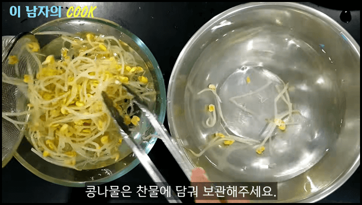 7) 찬물에 담근 다음 바로 다음 찬물로 옮겨줍니다. 이렇게 찬물로 2번을 헹궈야 콩나물의 아삭한 식감이 살아납니다.