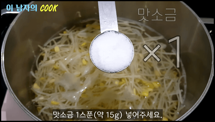 3) 간을 할 소금을 넣어주는데, MSG가 배합된 맛소금을 넣어줍니다. 계량 스푼으로 1스푼, 약 15g 정도 넣어줍니다. 콩나물 자체는 큰 맛을 주지 않으므로 콩나물국이 약간 짭짤해야 맛이 좋습니다.