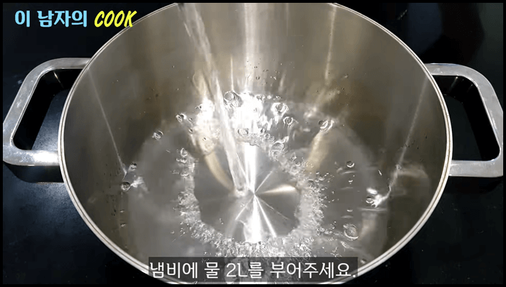2) 냄비에 물 2리터를 부어줍니다. 이 정도 양이면 5~6인분 정도의 양입니다.