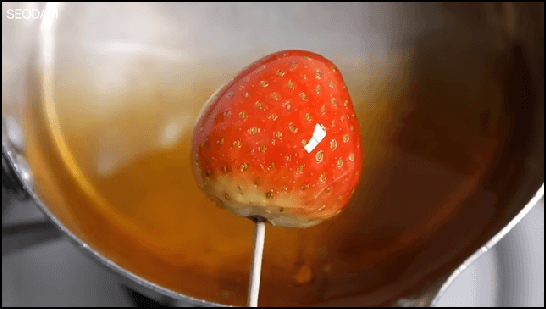 시럽이 완성되었다면 이제 과일에 시럽을 입혀줍니다. 시럽을 입힐 때는 과일이 익지 않도록 꼬치를 빠르게 돌려서 입혀주어야 합닌다. 시럽이 너무 두꺼워도 맛이 없으니 딱 한바퀴만 굴려줍니다. 만약 시럽을 입히는 중에 냄비 속 시럽이 굳으면 불을 약하게 켜서 다시 시럽을 녹여주면 됩니다.