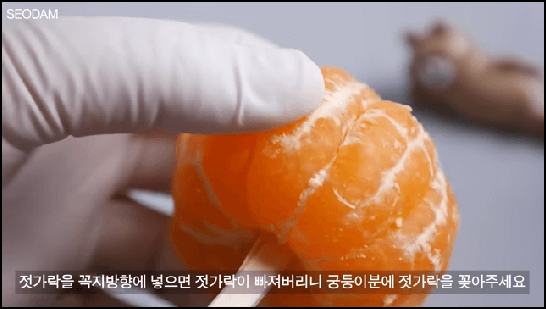귤은 속껍질이 딸려나가지 않게 껍질을 살살 벗겨줍니다. 그리고 딸기는 겉이 반질반질하고 깨끗한 딸기로만 준비합니다. 무르고 상처난 딸기를 사용하면 시럽을 입힐 때 과즙이 나와서 시럽이 망가집니다. 딸기 꼭지는 칼로 자르지 말고 손으로 똑 떼냅니다.