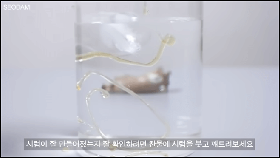 시럽이 잘 만들어졌는지 확인하는 방법은 찬물에 시럽을 부은 후 굳어진 시럽을 깨트려 보는 것입니다. 손으로 으깨보면 바삭 잘 부서집니다. 이 때 날카롭게 부서지면서 손을 다칠 수 있으니 주의해야 합니다.