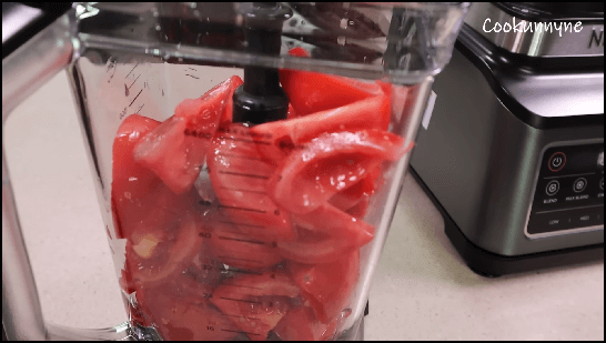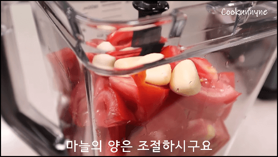 1) 먼저 토마토를 깨끗이 씻어서 적당한 크기로 썰어줍니다. 그리고 블렌더에 넣고, 마늘 8쪽도 같이 넣어서 갈아줍니다. 마늘은 토마토 1개당 1쪽을 넣어주는데, 마늘 양은 취향껏 조절하시면 됩니다.